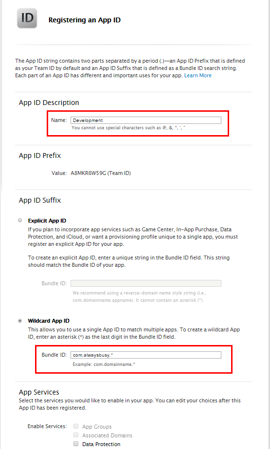 One part that may have gone a bit to fast for a first time Apple developer was the creation of an App ID. As Erel had his system already setup when he made the video and could just pick an App ID, he did not show us how to create it in the first place. It is mentioned further in the post you can create a single wildcard App ID if you put a .* at the end, but this was not very clear from the tutorial. So, this is how I did it: