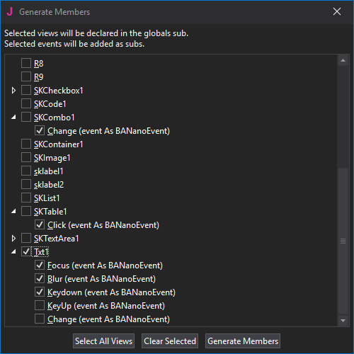 Sub Process_Globals Private BANano As BANano ... Private Txt1 As SKTextBox End Sub ... Sub Txt1_Focus (event As BANanoEvent) End Sub Sub Txt1_Blur (event As BANanoEvent) End Sub Sub Txt1_Keydown (event As BANanoEvent) End Sub Sub Txt1_KeyUp (event As BANanoEvent) End Sub Sub Txt1_Change (event As BANanoEvent) End Sub Sub Button1_Click (event As BANanoEvent) End Sub Sub SKTable1_Click (event As BANanoEvent) End Sub